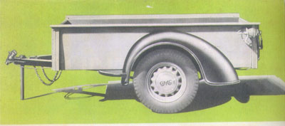 One of General Motors ideas was to increase sales by adding a new product that their GMC dealers could market. This was the Trail-about, an all-purpose small trailer that could be used by both car and truck owners. GMC produced it with little added expense. Most items were already used on their 1/2 ton pickup. The bed, taillights, fenders, wheels, and hubcaps were in stock. The additional GM investment was the light weight metal frame with tongue.