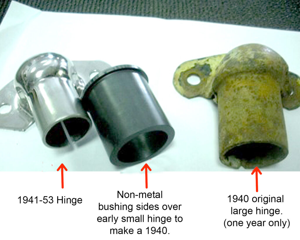 Solution to a problem: Pure 1940 tailgate hinges are not being reproduced. Even if you have a rare 1940 Chevrolet or GMC pickup with restorable original tailgate, your large hinges may be in very poor condition and not restorable. The solution is now on the market! A non-metal bushing is now available that fits over a 1941-53 hinge. This builds up the horizontal surface to equal that of a wide 1940. Congratulations, you can now have the proper hinge for your “one year only” 1940 tailgate!