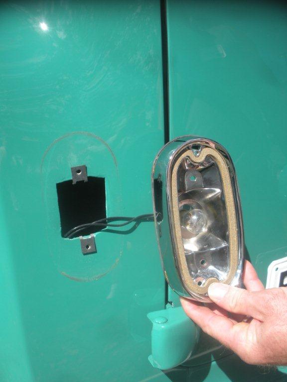 Tail Light in Hand... Notice the GM dealership body shop cut to make room for the optional tail lights. These cuts were discovered by George VanOrden during a ground up restoration of his all original 1955 panel.