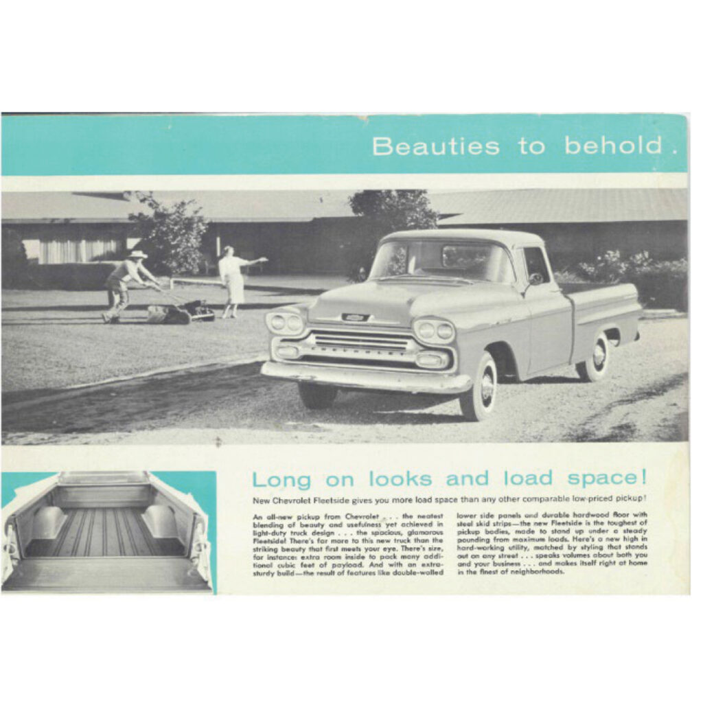 This photo is from a 1958 Chevy Fleetside sales brochure. Text below is in their words…