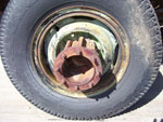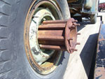 This new steel center hub extension includes eight long bolts to reach the original wheel studs. This holds the factory wheel in place and then provides a threaded end for the original eight lug nuts which are holding another matching wheel.