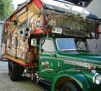 This has been quite a project considering the truck only has a 134" wheel-base. Audiences love Dirk's magic wagon because it is a touch of old Vaudeville with a splash of 1990's humor. Dirk has definitely found a niche that draws "oohs and ahhs" when he arrives in his in his gypsy green truck with wood shingle sides at festivals, corporate picnics, and schools.