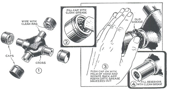 Packing a universal joint is easy if you follow this procedure. When the joint is disassembled, wipe out as much of the dirty grease in the cap and cross as you can reach with a clean rag. Then fill the cup with clean grease and force it back on the cross shaft, twisting it back and forth with the palm of your hand. The dirty grease will be forced out and can be wiped away. Repeat until the grease comes out clean. Now you can fill the reservoir and reassemble the universal joint.