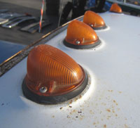 During the April 2012 Portland, Oregon swap meet, we noticed a very unusual feature on a 1972 Chevrolet ¾ ton. Five GM optional clearance lights were set on the front of the cab above the windshield. The surprise was the inverted dimples stamped at the factory. Amber plastic lenses are secured here. See photo.