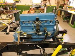 During the restoration the body was lifted from the frame rails and restored in his company bus barn. Butch personally restored the chassis at his home. He was surprised that some of the replaced rusty metal panels of this Carpenter body were put together at the factory with lead securing the seams (an old method) rather than welding. Butch broke all his records and did a ground up restoration in about 6 months.