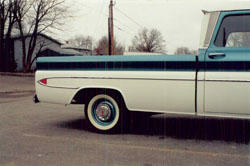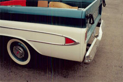 To remove chips and related paint damage the lower half of the body was sanded and painted the correct Pure White. The tailgate and wheels were refreshed with the original color Tampico Turquoise. The correct white wall tires for 1961 were installed.