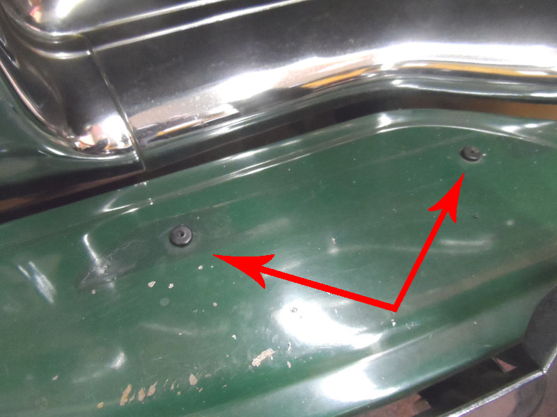 A problem when installed was that it lessened the visibility of the front license plate. Therefore, another change was made during the installation. The license was moved to the center of the front splash apron from the factory position on the right side. In the kit were two small rubber plugs. These filled the factory license bracket holes that existed when the factory license bracket was removed.