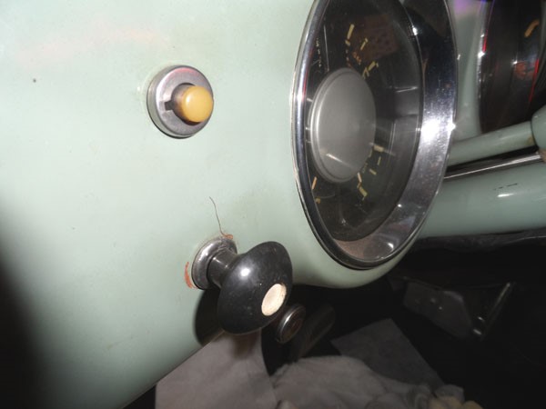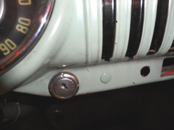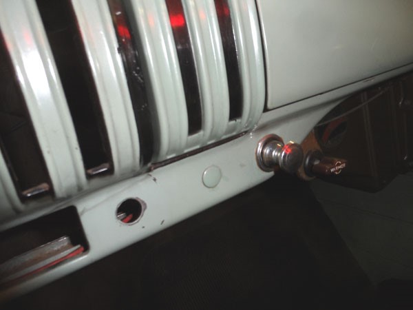 The truck with a Hydramatic has an automatic choke on the carburetor, there is no need for manual pull choke. Thus, GM installed a small blank out plug in the hole where the choke lever is usually found (at the left of the radio position). At the right is another plugged hole which is usually for a throttle lever.