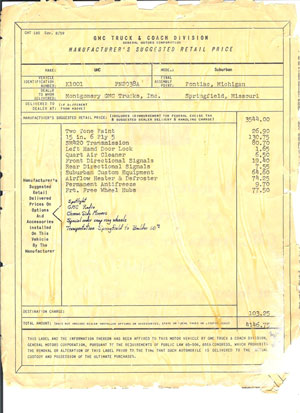 It was purchased new in Springfield, Missouri with a list price of $4,146.75. Almost a $1,000.00 above the base price of the Chevrolet Suburban. See attached window stickers and invoice. Records show it was then licensed in Colorado, a popular state for 4 wheel drive trucks. As Suburban’s are usually people haulers, this unit was probably used by a family as a driver. The lack of air conditioning was no problem in the high country of Colorado!