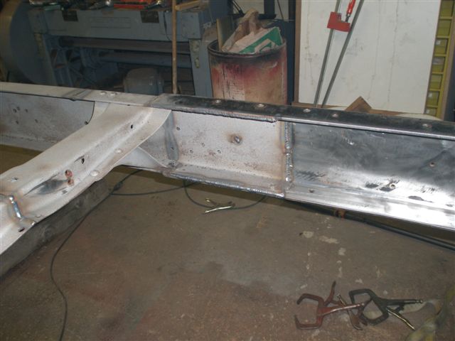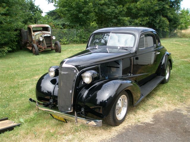 Sitting in the background in the photo of his modified 1937 Chevy coupe is the 1937 1 ½ ton truck that he combined with the motor home chassis about 3 years ago. During the creation of this special truck, the original 1937 frame was cut just behind the cab and grafted to the motor home frame side rails. Barney was amazed how nice the 1937 frame rails slid into those of the larger motor home once it was narrowed. The result gives excellent frame support.