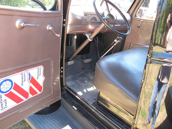 All is now black again on the outside and it has the correct tan hammered paint on the interior. Howard made it as close to its first day in the field as possible. Note the heavy front bumper. This is the first year the Chevy 2 tons were given this extra heavy steel unit. Howard removed a large accessory grille guard from the bumper during the restoration. It had probably been in place since it was new. The odometer showed almost 16,000 original miles on the truck.