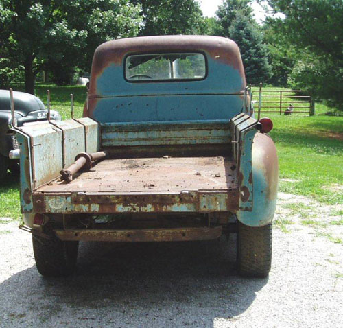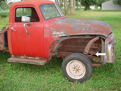 Check out the tall gas spout on the un-restored truck. On a 1947-48 GMC 1 ton pickup it is between the bed and cab and connects to an under bed tank.