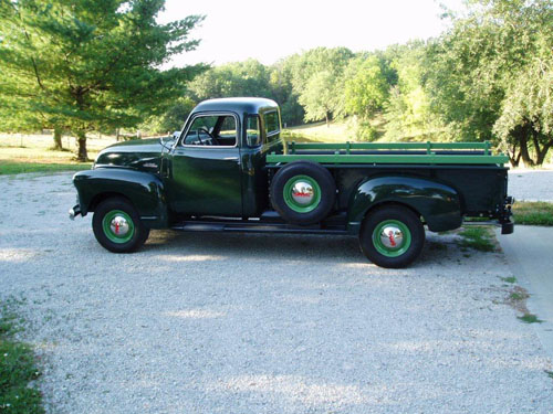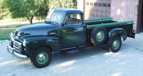 Joe Miller of Smithville, MO is the person responsible for saving this unusual GMC and making it into a piece of artwork. Most from the 2 year restoration is just like it was when it left the factory. Even the Brewster Green with Apple Green stripe and wheels is how GMC made most. It is suspected this long pickup was even an eye catcher in its early years!