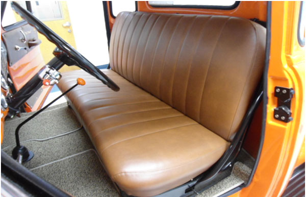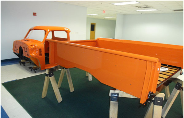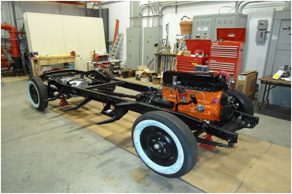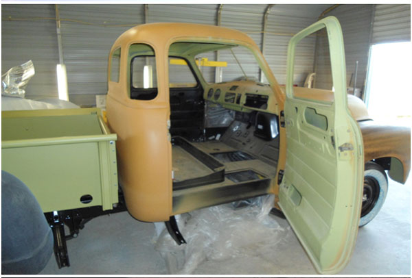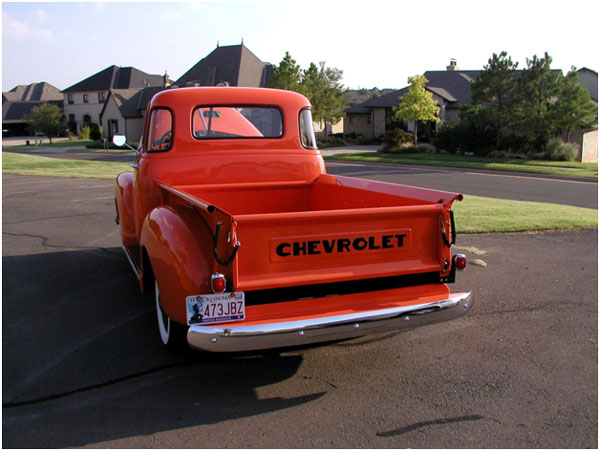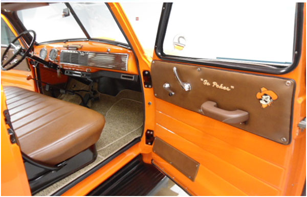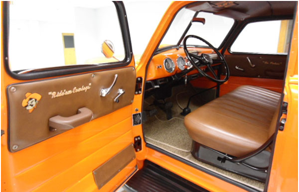 Combine a love for vintage vehicles plus a strong support for the “home team” and you have our Feature Truck of the Month. The pickup is a deluxe 1948 Chevy ½ ton rebuilt on its freshly powder coated frame. The exterior was carefully restored just like it left the factory except it is the official color of the Oklahoma State University in Stillwater, OK. Note the cab interior that is also based on the same color as the university.
