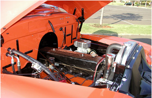 Tad kept the original 4 speed transmission and the bullet-proof closed drive shaft system. To get 20% better highway speed he changed the differential gears from the original 4.11 ratio to a 3.55. The front disc brakes are hidden from view but Tad feels much safer with this upgrade. The electronic ignition system plus a 6 volt starter and flywheel causes the engine to start before every one engine revolution.