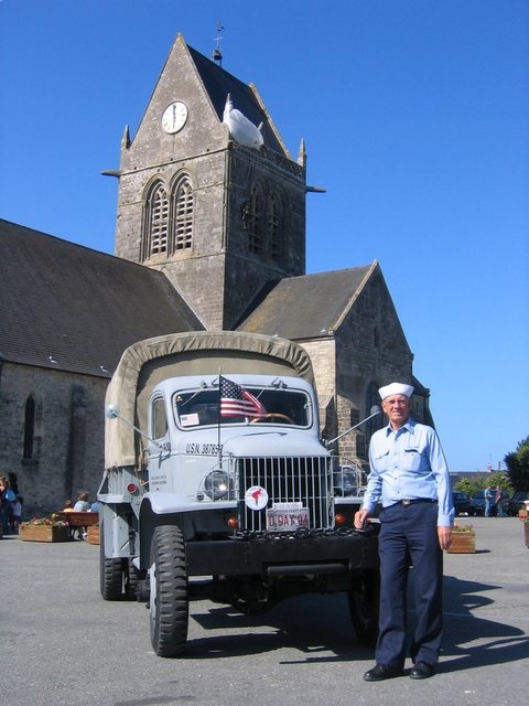 Herman and his Chevy in front of the famous church in Ste Mere Eglise, one of the first villages liberated by US paratroopers on June 6, 1944.