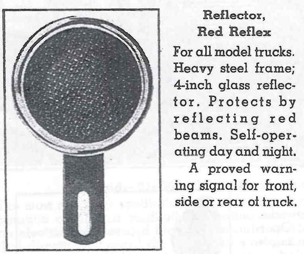 This was a time when town street lights were limited. Of course, on the open road these were no lighting along the highways! This simple GM reflector was offered by the dealers to prevent rear end accidents. The customer could buy this dealer accessory from about 1940 through 1953. One of the attached photos is taken from a 1949 Chevrolet Truck Data Book. The 4 inch lens is a Stimsonite # 24 and the metal Guide ring has a stamping of X-19.