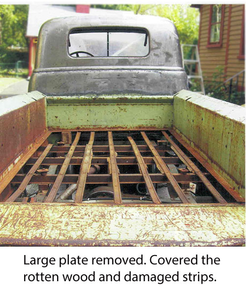 No windshield (caused interior damage), a metal plate covered the rotten wood and cross sills, 3 fenders a total loss, and enough caked mud and dirt removed to start a 50’ x 50’ vegetable garden. Yes, the farmer had tried to keep the body going by just covering the rust with Bondo. Oops, he had forgot to add enough antifreeze one winter so the truck’s replacement 235 engine (1954-55) had a 10” crack in the block that was spot-welded by the other owner.