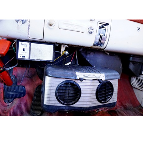 Notice the left chrome air vent cable and knob under the dash. Because of the air conditioner unit, it must be positioned on an angle.
