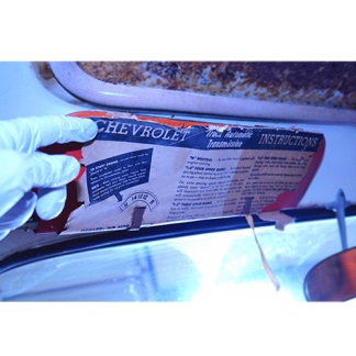 On the underside of the driver’s sun visor is an instruction sheet explaining how to operate the Hydromatic transmission. With automatic transmissions NEW to many in 1956, these sheets were of help to the first owner. This is especially true on the 4-speed Hydromatic that is placed in park different. Put it in reverse and shut off the engine. Now you are in park!