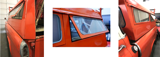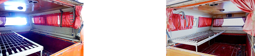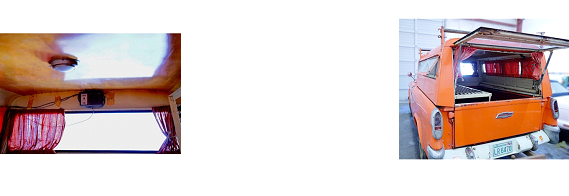 Sometime after this Cameo purchase, the owner had the Topper installed. He must have been an outdoors person as the top is more than just a cover. Its extras include slider windows with curtains on the sides and curtains over the front and rear stationary windows. Also, there is a varnished plywood ceiling with adjustable round air vent plus a light, and a pair of swing down bed spring frames (like at a boy scout camp).