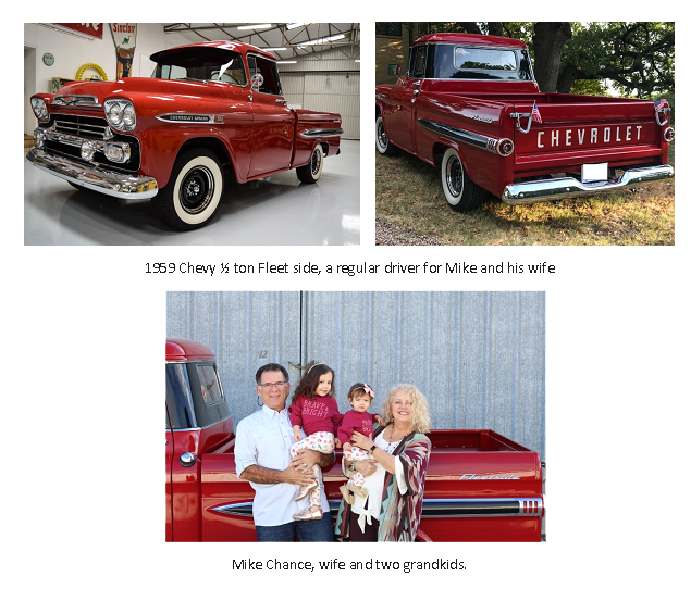 Mike’s interest in older vehicles comes from his father’s hobby of collecting older cars and trucks. At times he has had over 50 unique special interest vehicles. Now, at 85, his father has kept his two favorites. A 1955 Chevy car and a 1972 Chevy ½ ton pickup both of which he drives regularly. In addition he walks and jogs about 10 miles each week. What a great example to all of us. Mike and Tyler, has some big shoes to fill in being involved in this restoration company.