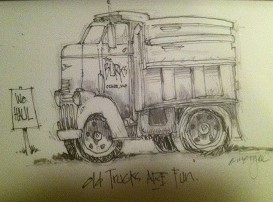 An artist admirer and friend, Earl Morgan, sent the Burk’s this pen and ink drawing titled “Old Trucks are Fun.” Very Impressive!