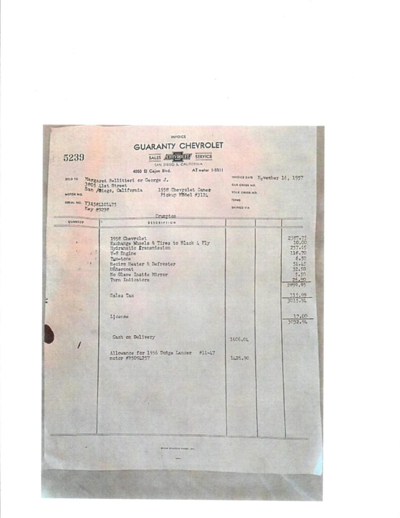How rare! Most invoices were discarded soon after the purchase! This shows the day of the sale of a 1958 Cardinal Red Cameo as first purchased November 16, 1957. It is now owned by Kevin Rantuccio in Florida in 2021. The original invoice was included with the sale.