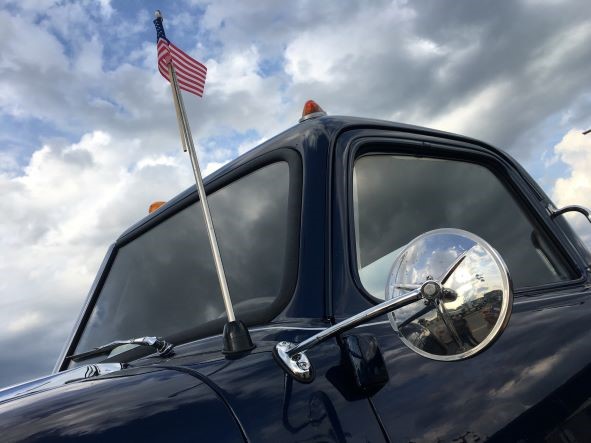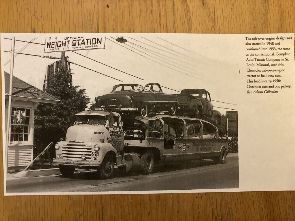 Originally, the truck was a 1950 Chevrolet 5100 COE car hauler for the Complete Auto Transit Company of St. Louis, Missouri with a 110” wheelbase, a 5th wheel plate and trailer brake handle. On the passenger firewall, it had an engine oil reservoir built by the Stanley Muffler Company and a Dietz spare bulb container under the hood in front of the radiator.
