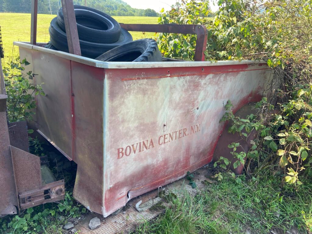 It had been driven to the farm with the intention of installing a more farm-friendly bed. First driven to a back, out of sight, field where the fire truck bed was removed and left by a fence row for 28 years. Miraculously, it still resided in the same place! Note the photo below showing a small corner of the bed after some weeds were removed! There were the letters, Bovina Center, NY.