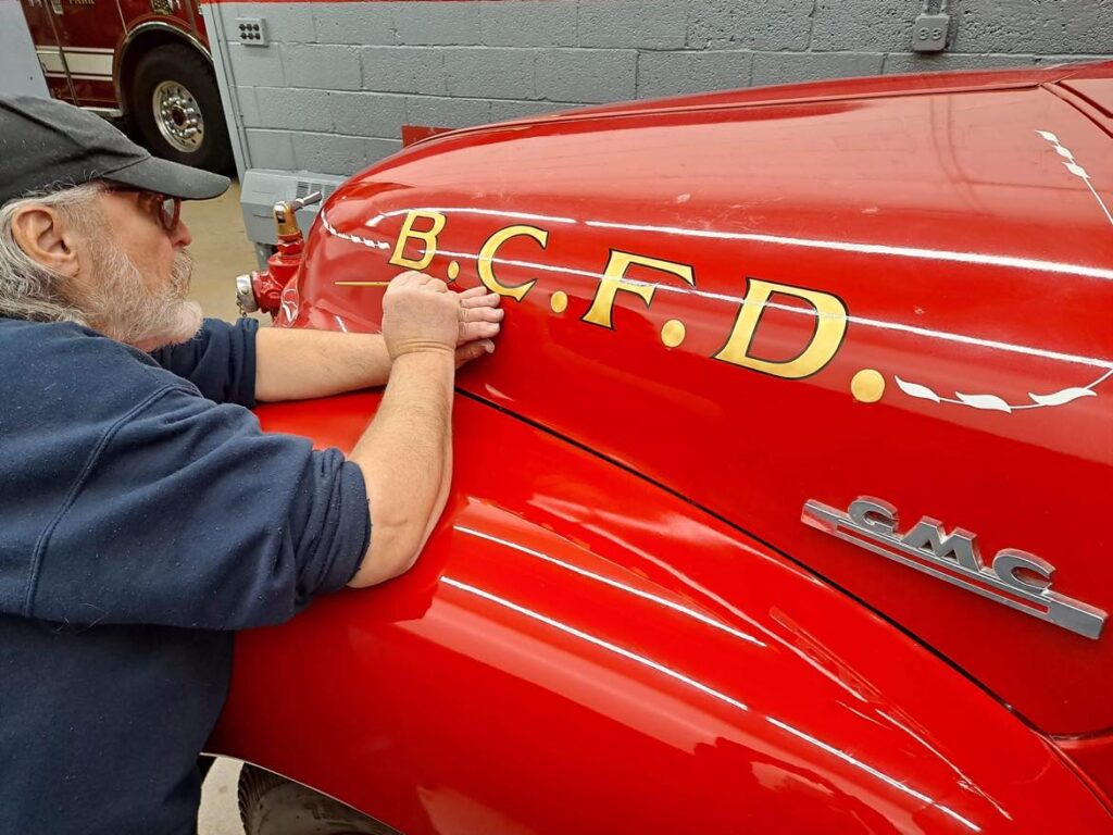 In mid-October of 2021the truck’s body once more was separated from the chassis for a full paint job. With the assistance of fire fighter Bill Sprague from Delhi, NY the truck received a coat of “Victory Red” paint. The rest of the winter was spent reassembling the truck. In March of 2022 it was towed to New Jersey where the gold leaf and pin striping was recreated by Ed May. Ed spent about 1 ½ weeks working to create the original artwork based off on the tracings made the previous fall. See photos of Ed doing his talents.