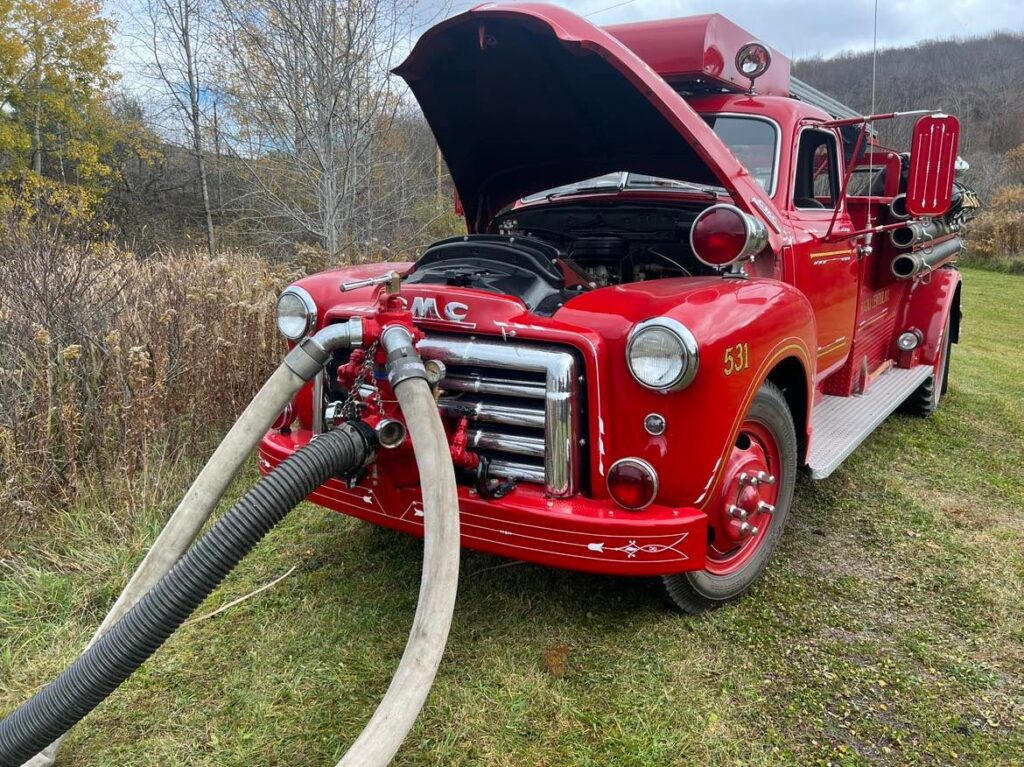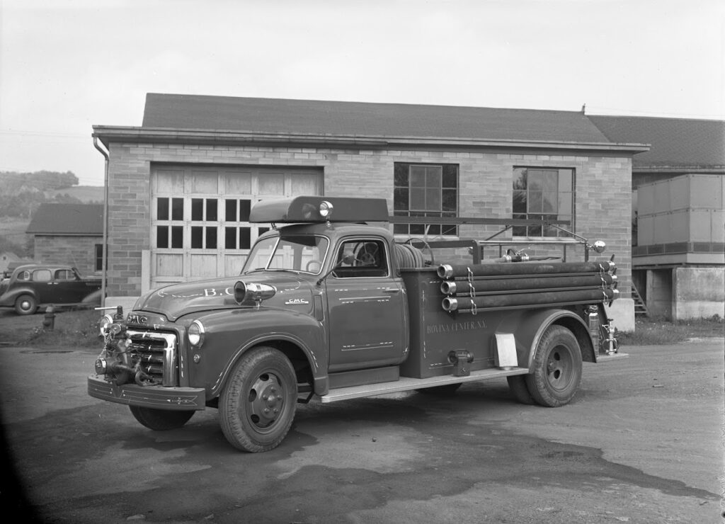 Prior to the arrival of this NEW GMC fire truck in 1948 at least three fire companies had been organized in close adjacent communities in the Catskill Mountains near upstate Bovina Center, New York. At that time, some equipment still consisted of a hand drawn hose cart and another for a hand ladder cart, (before city water lines) all pulled by able body volunteers. (The department still shows these original pieces at community events.)