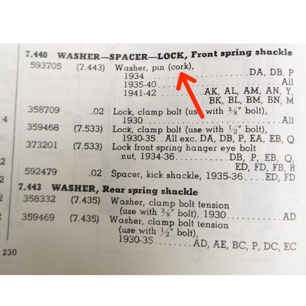 The photo is an excellent example of early round shackle seals of cork in an often driven 1938 Chevrolet ½ ton belonging to Glen Andrews in North Carolina. He “ground up” restored this show winning pickup that is about as it came off the assembly line 85 years ago. There was no question. The shackle had to have cork seals.