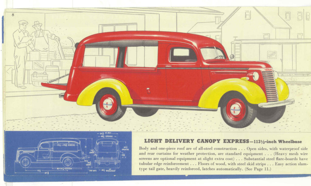 We hope this article provides you with interesting data on one of the rarest early Chevrolet ½ ton trucks. They are a part of our country’s history during the 1930’s through the mid 1950’s. These little ½ tons ( with only a seat for the driver), provided a convenient method of selling groceries and related items to residential neighborhoods that had limited nearby local stores. We understand that some stores even used a bell with a rope installed for the driver to ring as he slowly moved down residential streets. They are referred to as a Canopy Express.