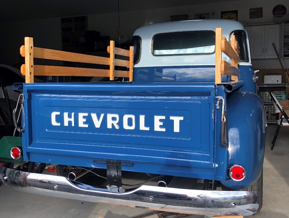 He has owned it two years with no regrets, while adding little improvements while it was usually drivable. He has kept the correct Gray 235 six cylinder engine (one of GM’s greats) but removed the 3 speed column shift assembly and added an accessory floor shift 4 speed transmission with the granny first gear. This is the top of the line model with corner cab windows and the optional white top. The lower color is Skyline Blue.