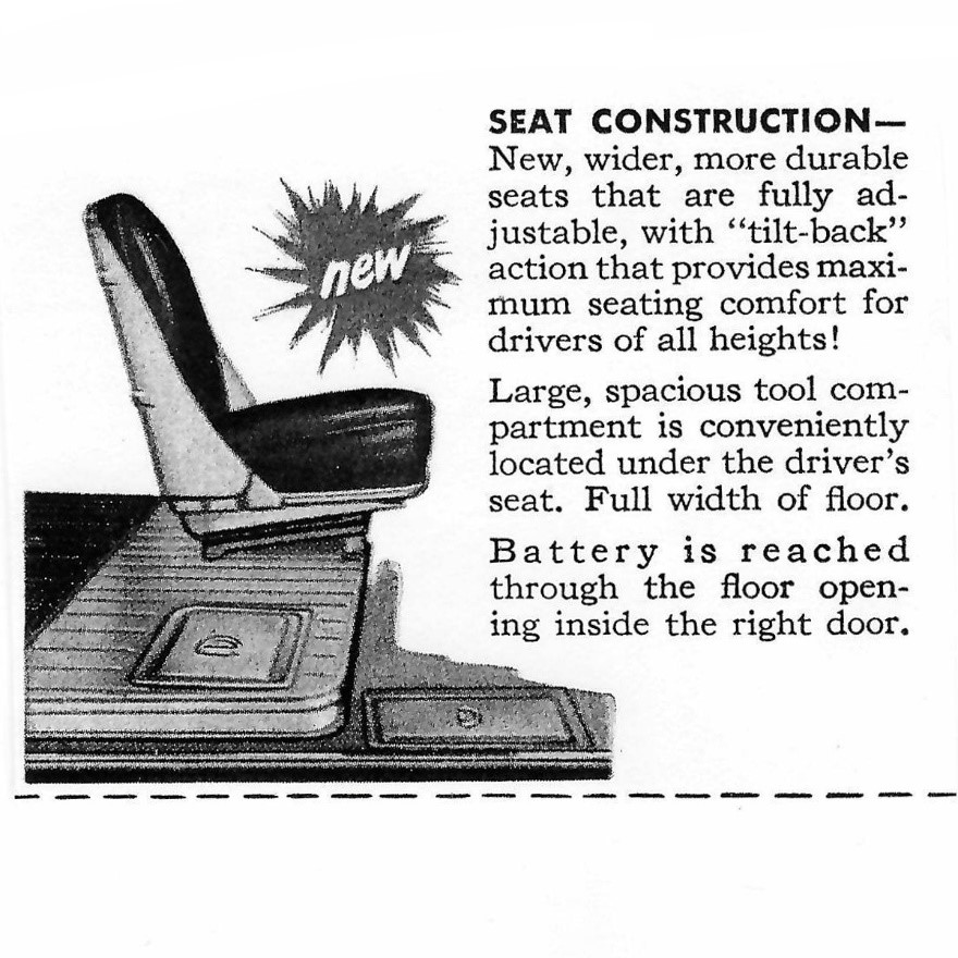 Back in the late 1940’s when safety was not the issue as today, this seat appears to lack something we would not forget in today’s world. (This is not so dangerous on the Canopy Express because a plywood panel is behind the driver.) It is particularly bad on the panel truck as the driver is not protected from merchandise sliding forward on an emergency stop such as boxes, lumber, plumbing pipes, etc. When this happens the driver will find himself crushed between the items pushing the seat back forward to the steering wheel and column. What does that do to the driver’s rib cage?