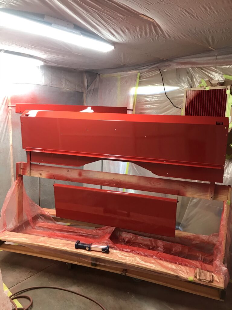 This is the most surprising! He wanted the original Swifts Red color to be applied as at the factory. Not 2 stage (Base coat, clear coat paint) as most all vehicles today, but in single stage enamel! If you ever get a run by applying too much paint, you must wait until the total part is dry, sand it back to the smooth surface and spray again. We did not ask John how many times this happened, not to mention if any dust entered the drying paint.