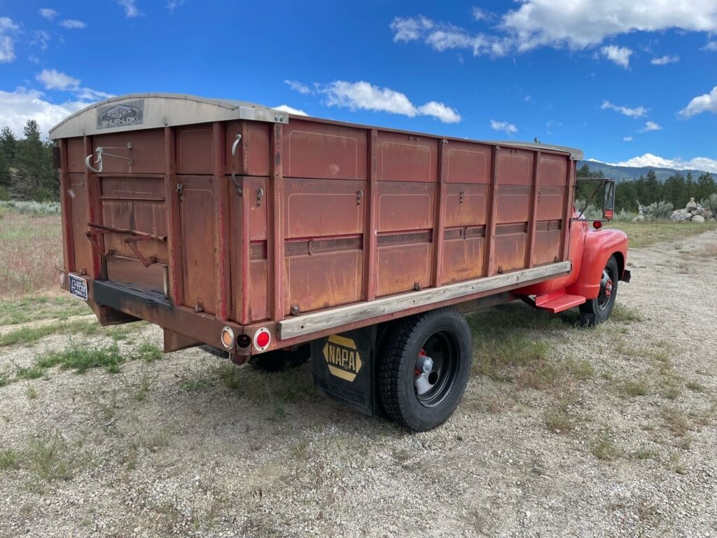 B. An excellent accessory (probably why Larry bought this truck) was its 12’ long Knopheide grain bed with hydraulic lift. All in great condition! This tilts at the front for removing grain, etc. In this case, removing so much lumber on the Buchanan’s site needed for their home and shop construction. The many boards just slid out!
