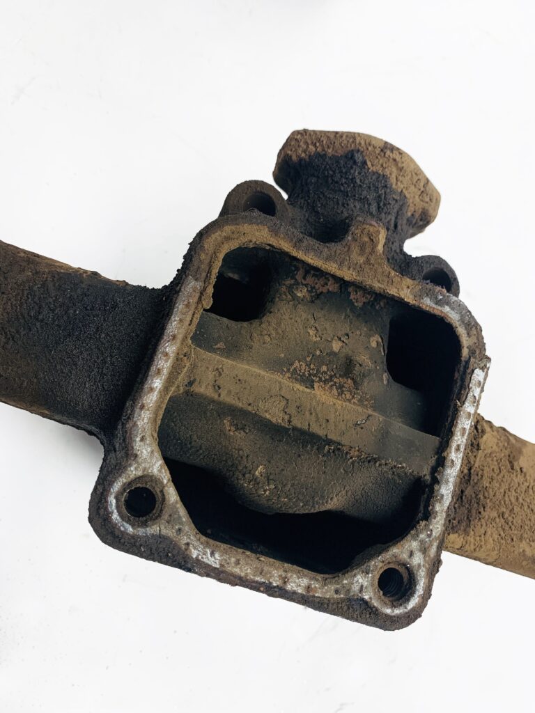 The underside of the intake manifold where it attaches to the top of the exhaust manifold. Note the many ridges in the intake that allow for quicker warming the gasoline on a cold engine. This is from the carburetor that has just combined fuel combustion and air.