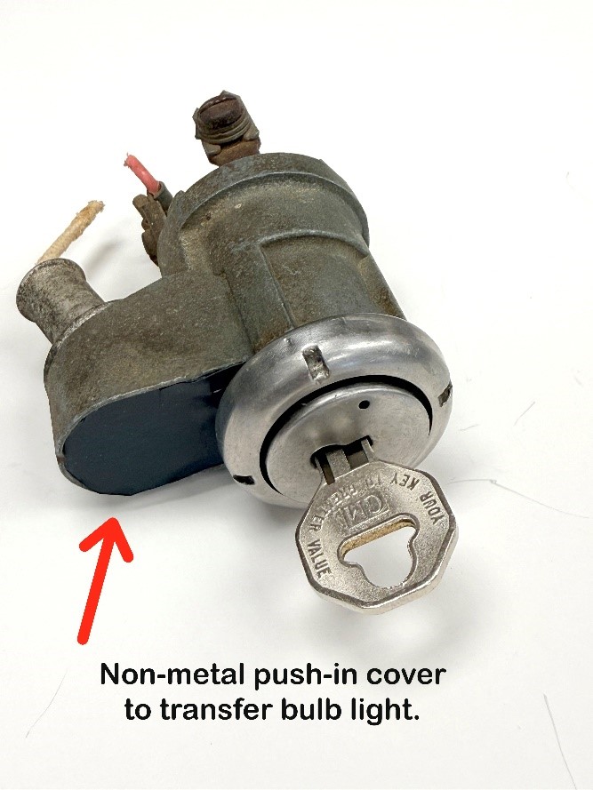 Between the years 1947-1953, the switch and cylinder combination, plus a one candle power bulb and socket was attached to a sheet metal housing. This assembly is screwed to the top of the lower inside dash lip out of sight. Only the round key cylinder face is seen by the driver. It extends through a larger hole in the dash. A resulting 1-1/16 inch circle opening between the dash and this cylinder face produces a lighted ring at night from the adjacent small bulb. This allows the driver to easily locate the switch in the dark. He only needed to pull the light switch to park position to see where to place the ignition key.