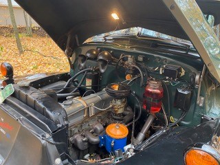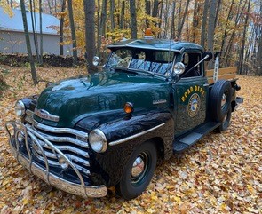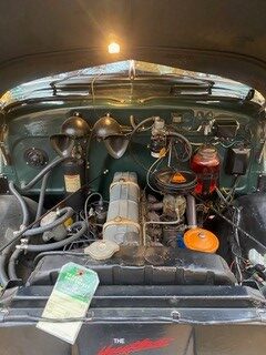 The truck began turning heads when I was able to get it back on the road again August 2009. It now has nearly 11,000 miles on a completely rebuilt 235 c.i. 6-cylinder engine pulled from a 1955 Chevy truck. It runs just like an old sewing machine. I swapped out the 235 valve cover with a 216 valve cover, and am using some unique vintage after-market brass hold-down brackets. (Very rare) See the Technical Article written on the Jim Carter Truck Parts website. The 6-volt truck has its original 4-speed stick (floor) shift with a 4.11 rear-axle. It runs really sweet 55 - 60 M.P.H. during my annual driving season of April - October. The fall 2022 standard tune-up included replacing the clutch. A rebuilt single barrel Rochester B carburetor helps me get about 15 m.p.g. using Rec 90 ethanol free gasoline. The engine bay sports several accessories that spark interesting conversations with lookers. They include dual horns, N.O.S. windshield washer, Trico Electro-Vac wiper booster motor, an overflow radiator tank, A.C. bypass oil filter, and an N.O.S. Perry Cooling System filter system.