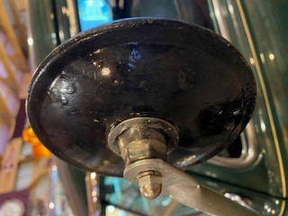 Some accessory items have been obtained and re-installed in some of these holes. A hole in the dashboard is where the wiring for the vintage N.O.S. illuminated Hull compass passes through. A vintage one-quart brass Pyrene fire extinguisher (non-working) is mounted on the passenger-side kick panel near the Harrison heater. The mounting holes for the bracket fit exactly where the pre-existing holes were located in the sheet metal. The same is true for a N.O.S. Casco rubber-bladed fan on the upper-left of the dash.