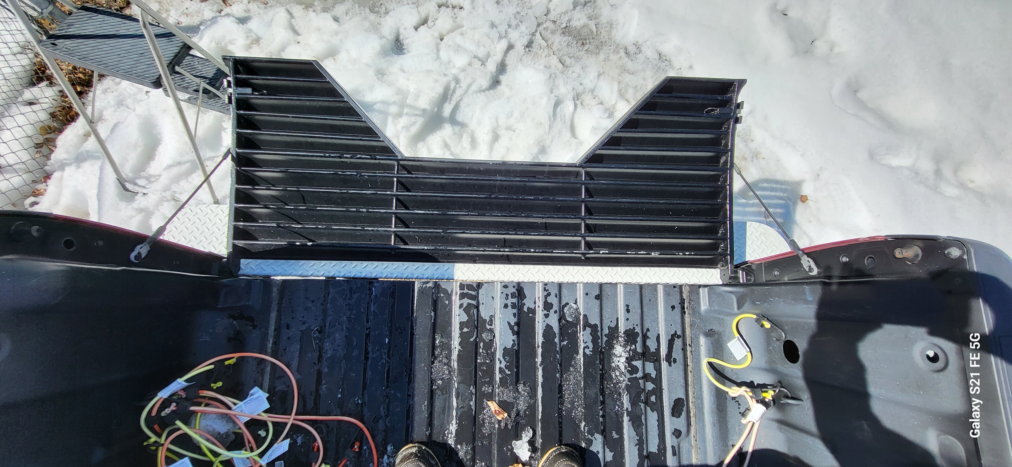 Standing in the bed. Photo of the very unusual open tailgate.