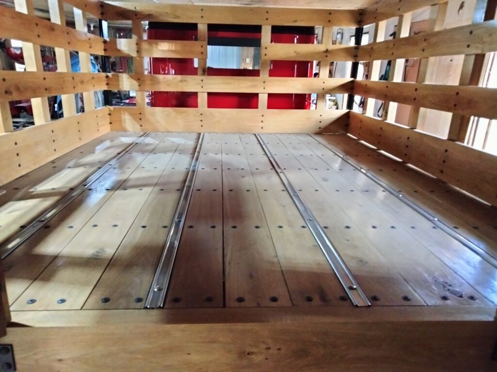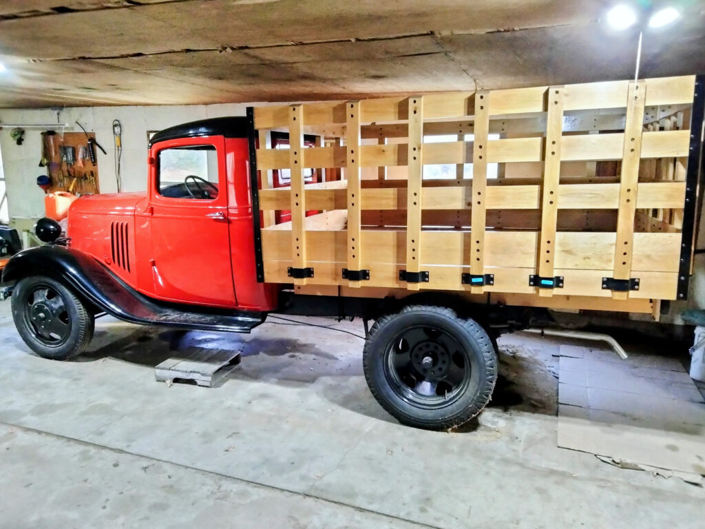 The next process was to build a bed of some type. In doing my homework along with a close friend, Dick Nubson, we managed to find a sales brochure and some specifications of a 1934 truck and stake box in the General Motors Heritage Center website. Dick then designed and blue printed the box. I set out to determine the wood needs to complete the task. Once I had written the specifications for the lumber needs, the next project was to secure the lumber. Someone to cut and mill the wood to the right size was Jeff Avelsgard. Once the logs were cut, the lumber had to dry. This process took over a year.”