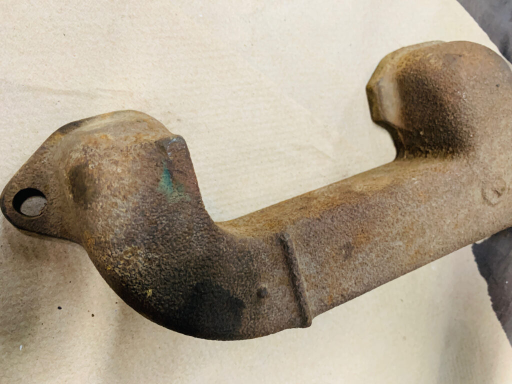 4. The vertical tube mentioned above is held in place by a “wrap around” sheet metal band surrounding the cast iron exhaust manifold. This is held in place by a ridge molded into this cast iron metal. See photo.
