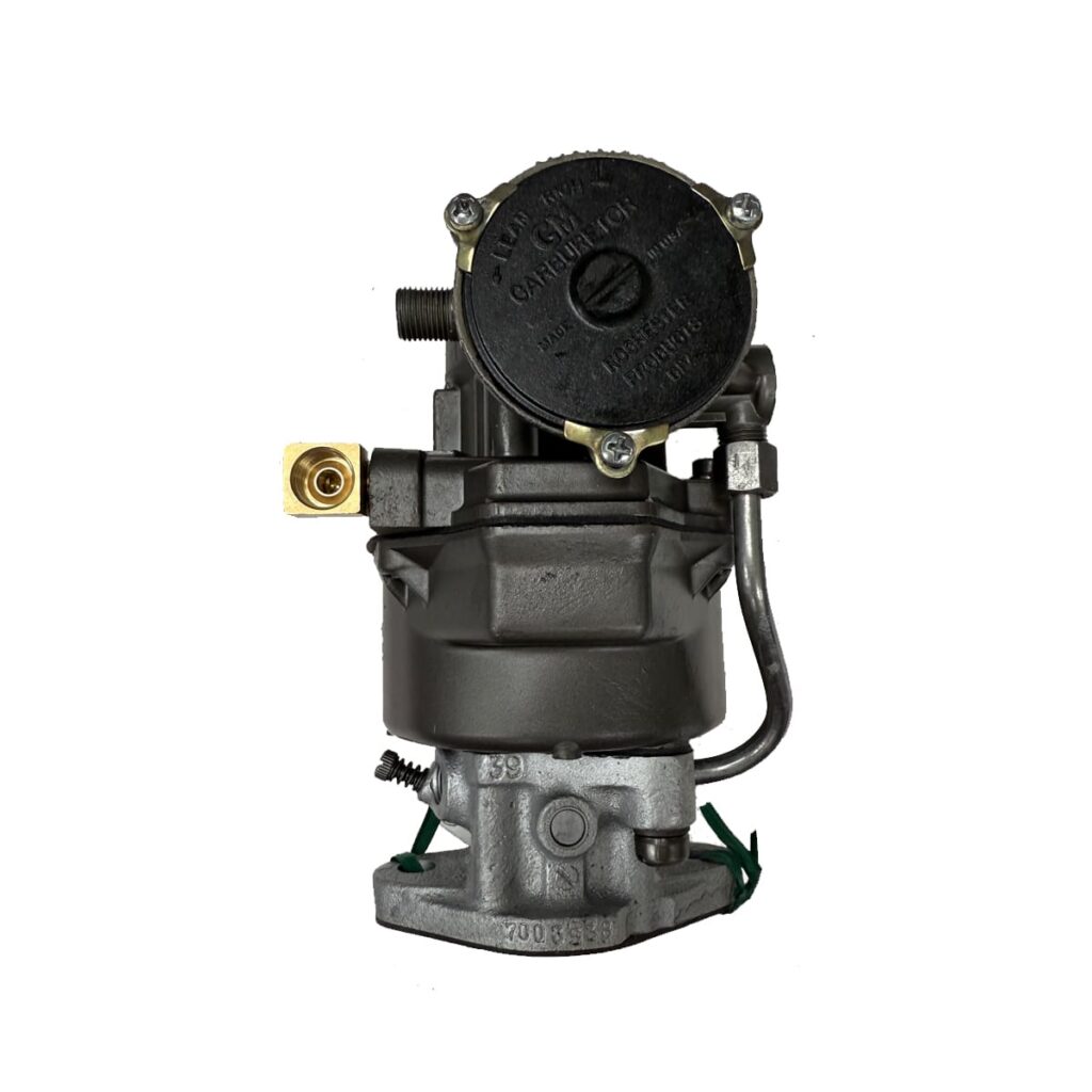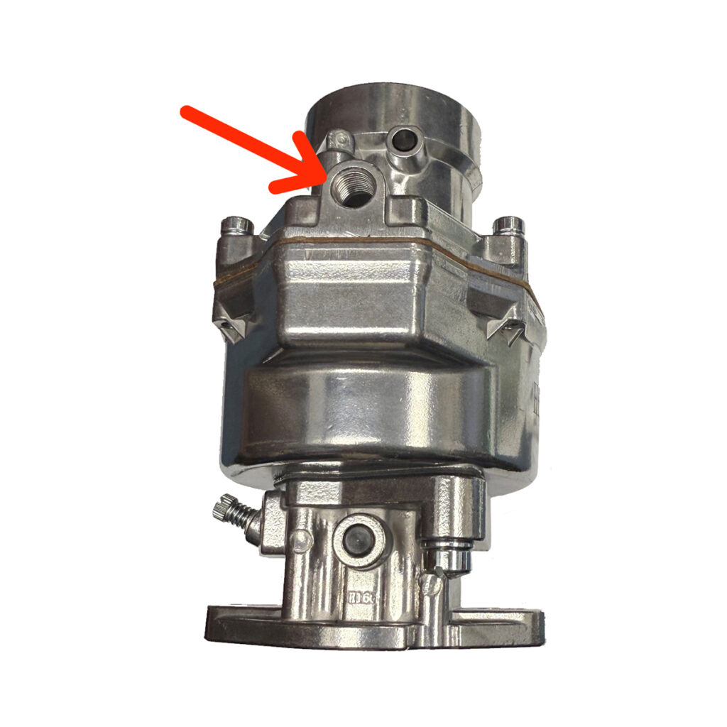 2. When adding the Power Glide Carburetor to a truck, the fuel connection must be moved to the right side. This allows the large automatic choke assembly to stay at the front which is the closest place for a vertical metal tube to reach the warm exhaust manifold. This required brass elbow fitting can be obtained from Jim Carter Truck Parts as part # MEE602.