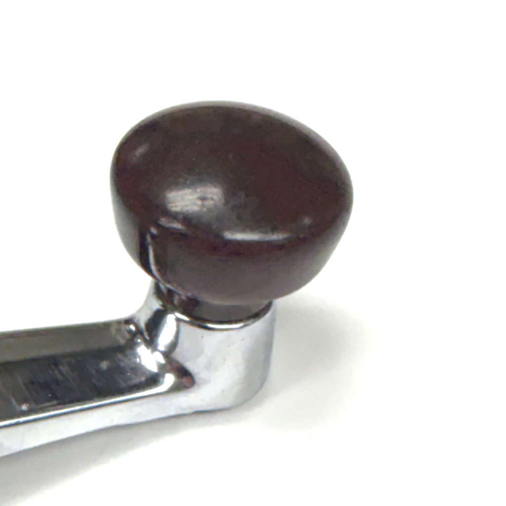The more expensive 1947-1948 Chrome die cast knob handles were discontinued in late 1948. GM replaced these knobs with a maroon non-metal design to match the same color grained door panels.