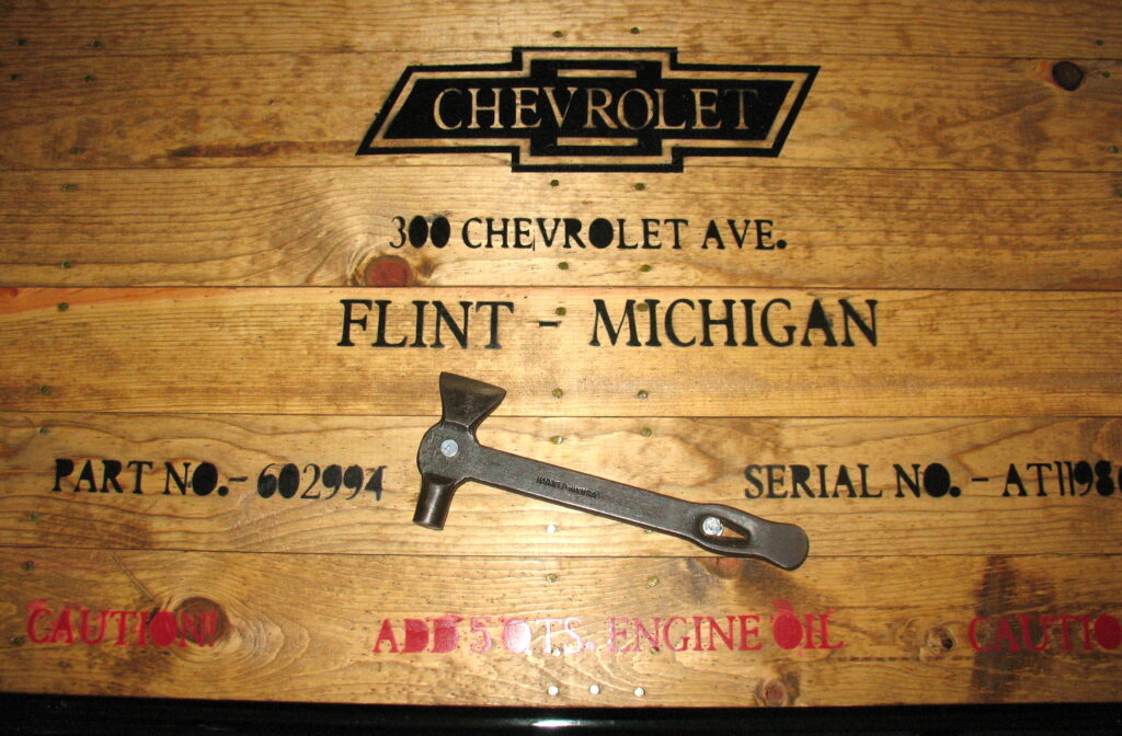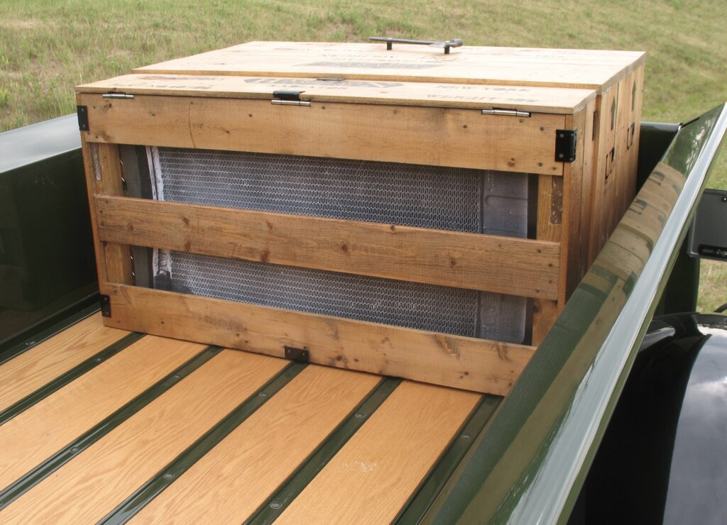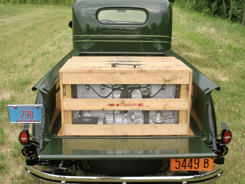 To transport lawn chairs, tools, a gallon of water, etc., Ray loaded a crate into the bed of his pickup. It conceals a diamond-plate toolbox that didn't go well with the '38 vehicle. He has a picture of a 1938 Chevy radiator in the front of the crate and a picture of a 1938 Chevy six-cylinder engine in the back. The top displays the accurate Chevrolet part numbers, the weight of the engines and radiators, the emblem, and the facility where they were manufactured. In case I have motor problems, Ray has an extra engine!