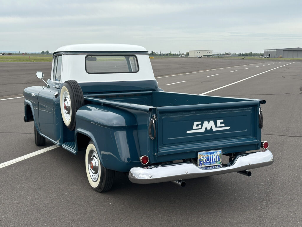 The side-mount spare tire on the left rear fender (without being under the bed) was just another eye-catcher that told Pete he had to have this rare GMC. Yes, of course, it has the famous logo stamped on the tailgate, so following traffic has no doubt who is ahead of them!